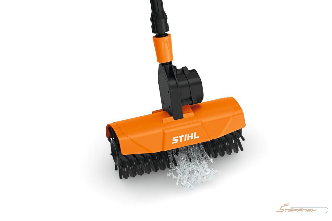 Díky bajonetové spojce můžete rotační kartáčový válec snadno a rychle připojit přímo k pistoli STIHL. Kartáče lze také snadno a bez použití nářadí vyměnit pomocí rychloupínacího spoje. Rotační kartáčový válec má pracovní šířku 30 cm a ochranný kryt, který chrání osoby a okolí před stříkající vodou.